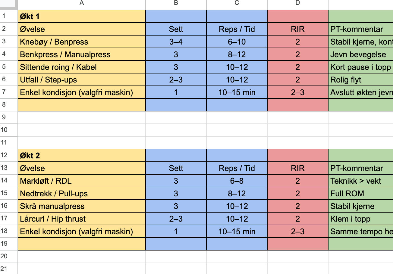 Personlig treningsprogram tilpasset nivå og tilgjengelig utstyrKostholdsopplegg med enkle og fleksible rammerStruktur for 8 eller 16 ukerLevering innen 48–72 timer